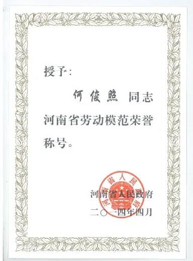 何俊照员工参加工作以来,始终秉持着地矿系统的“三光荣”传统和“四特别”精神,艰苦奋斗,锐意进取,创造出令人称道的不凡业绩。先后被评为“河南省劳动模范”、“河南省委省直机关优秀共产党员”、“河南省最美地质人”提名奖、“河南省优秀勘察经理”,两次被评为“河南省地矿系统劳动模范”,连续5年“河南省优秀项目经理”,连续多年被评为单位劳动模范、优秀党员、先进工作者。