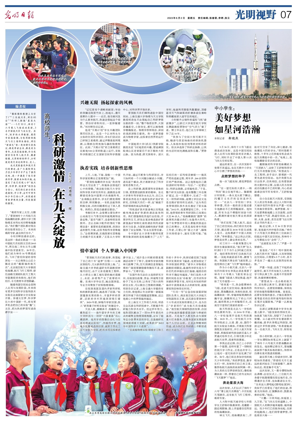 “天问一号”应急信标装置研制团队负责人、南京航空航天大学航天公司副经理王寅,还沉浸在看到神舟十六号成功发射的喜悦之中,也为自己“学者同行”成为航天员倍感振奋。“航空航天领域科技的发展,自创立伊始就深蕴着爱国创新与奉献的基因。不是每个人都有机会为国家重大任务服务,而服务国家发展值得每个人付出全部。正是这种精神的传递,成为我们在科研路上不断前进的巨大动力。”(刘博超 邓 晖)